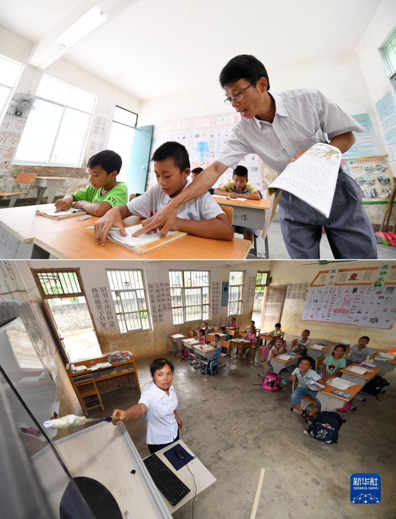 拼版照片:广西天等县进远乡进远村龙含教学点的农志鹏老师给学生上课(上图),广西天等县进远乡进远村龙坚教学点的梁碧莹老师给学生上课(下图)(2017年9月7日摄)。2017年,农志鹏和梁碧莹是广西天等县大山里一对夫妇教师,农志鹏是龙含教学点唯一的老师,梁碧莹是龙坚教学点唯一的老师,两个教学点之间被两座大山阻隔,来往不便,他们一家常常只有周末才能团聚。