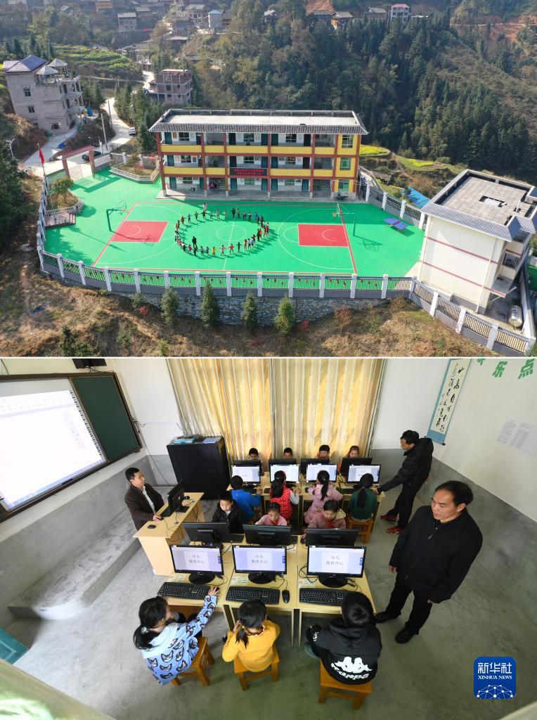 拼版照片:地处黔桂边界的登晒小学师生在课间一起做游戏(上图),登晒小学老师在给学生上课(下图)(2019年3月12日摄)。登晒小学同属贵州省黎平县龙额镇和广西壮族自治区三江侗族自治县富禄苗族乡,是黔桂共建的一个教学点,师生有的来自贵州,有的来自广西。1956年建校起,一批又一批老师坚守在这所有“一校跨两省区、两省区辖一校”之称的学校里。