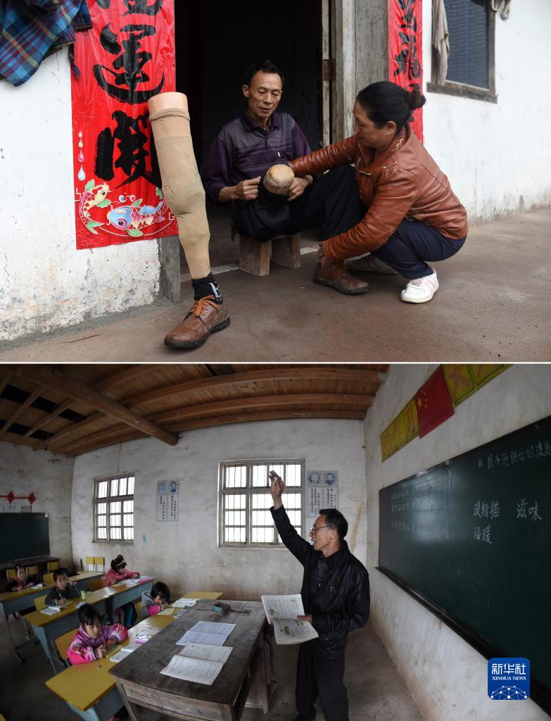 拼版照片:赵德花在野猪殿村的家门口帮爱人李祖清老师穿戴假肢(上图);广西灌阳县洞井瑶族乡野猪殿小学的李祖清老师给学生上课(下图)(2016年3月22日摄)。时年61岁的李祖清老师在1981年家访途中被毒蛇咬伤致小腿肌肉萎缩、骨骼坏死,成了残疾人,戴着假肢坚守讲台。2015年11月,因暂时没有新老师来接替他的岗位,他退休后接受返聘重回讲台。