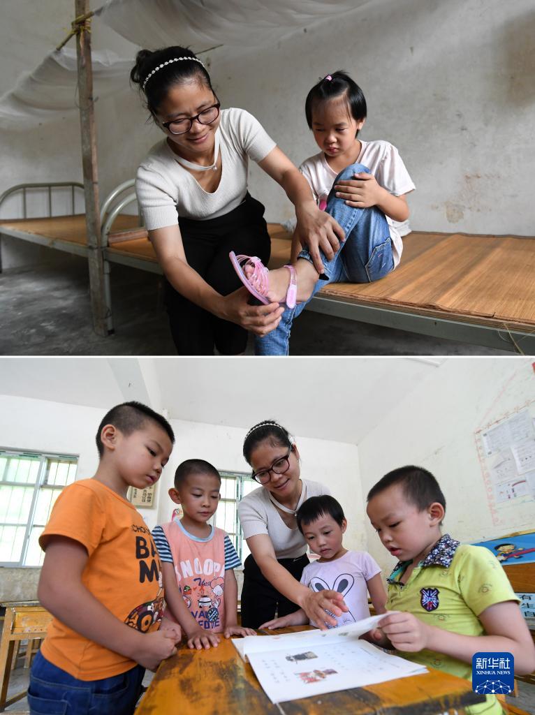 拼版照片:广西都安瑶族自治县龙湾乡琴棋小学的蓝巧春老师帮一名学生脱鞋准备睡午觉(上图),蓝巧春老师课间辅导学生功课(下图)(2017年8月31日摄)。1988年出生的蓝巧春毕业后曾在南宁市工作。听到家乡招聘教师后,她回到了大山。由于有学生寄宿学校,她每天除了给学生上课,还要给他们做饭,照顾他们的起居。