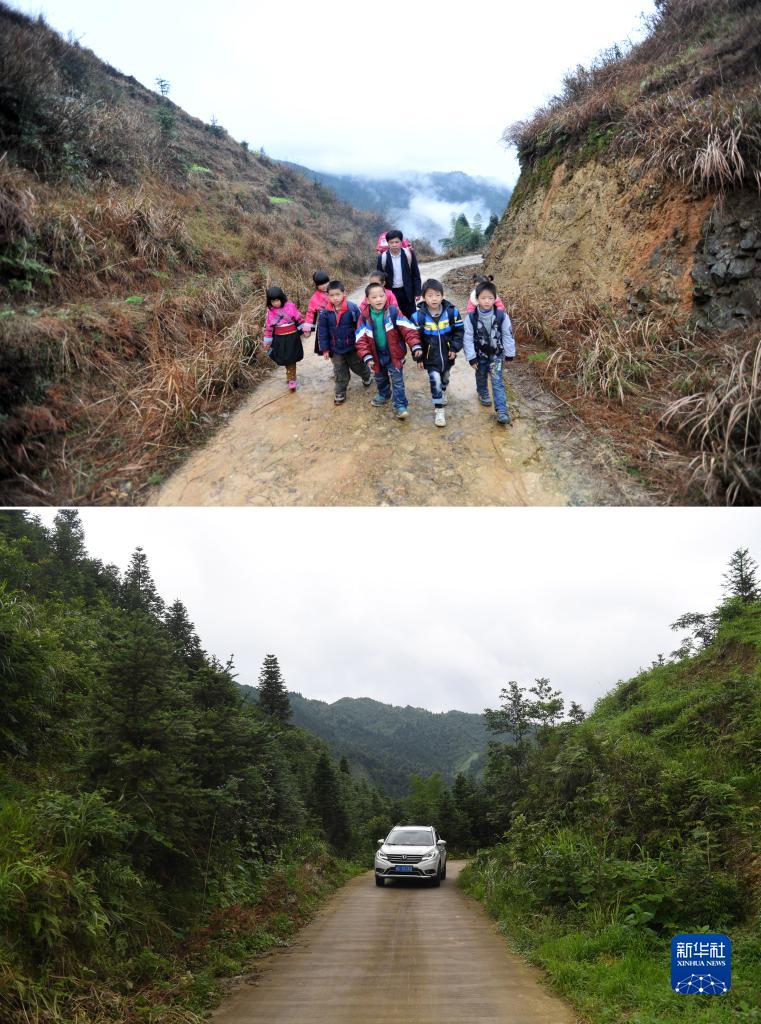 拼版照片:广西龙胜各族自治县龙脊镇江柳村翁江小学的余启贵老师背着背篓领着学生一起去学校(上图,2013年2月26日摄);余启贵老师开着汽车带着学生去学校(下图,2020年7月7日摄)。余启贵是翁江小学唯一的老师,在很长一段时间里,翁江小学没通公路,上学路上,他每天都背着装满书包或一个学生的背篓,领着学生徒步去学校,因此被称为“背篓老师”。2014年余启贵荣获“全国模范教师”称号。2016年,翁江小学修通水泥路,余启贵买了小汽车,开车带学生一起去学校,“背篓老师”变成“汽车老师”。
