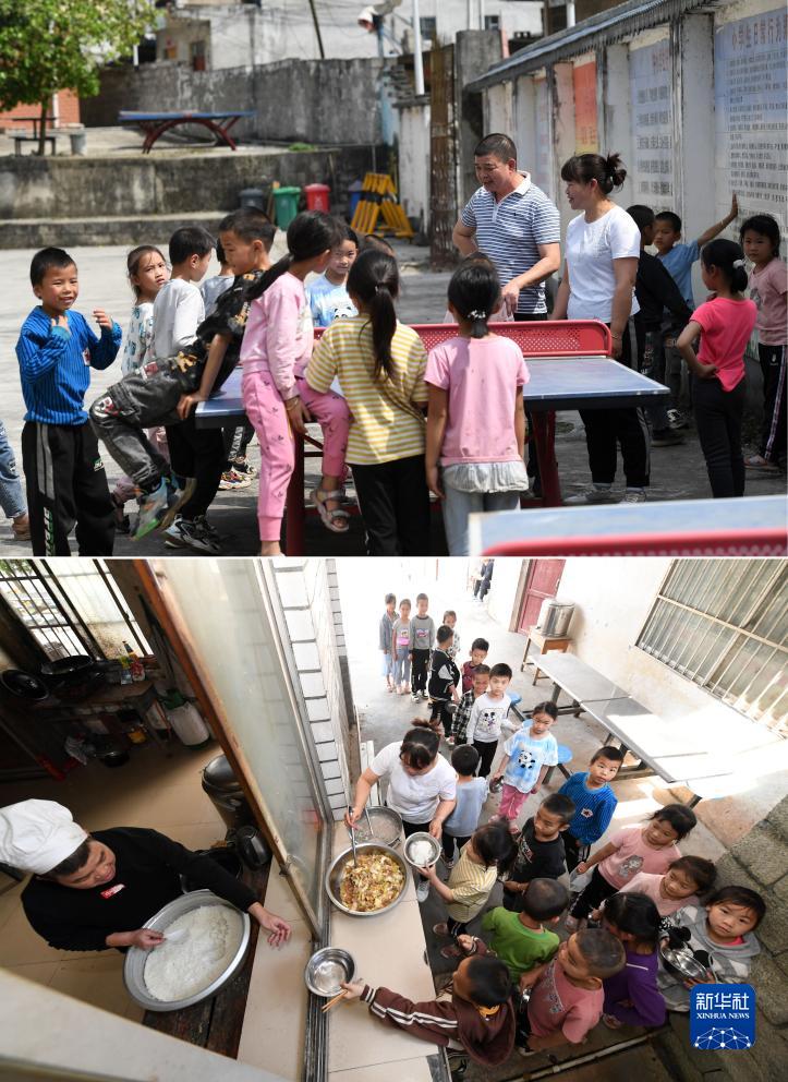 拼版照片:广西德保县东凌镇那王小学的黄永勇和黄秀碧课间和学生在一起休息(上图),黄永勇(左一)和黄秀碧在给学生分午餐(下图)(2023年3月22日摄)。广西德保县东凌镇那王小学地处山区,学校只有黄永勇和黄秀碧这对“夫妻档”老师。在这里,他们俩除了给学生上课,为学生做午饭,晚上还要照顾离家较远住校的学生,只有周末才能回家。