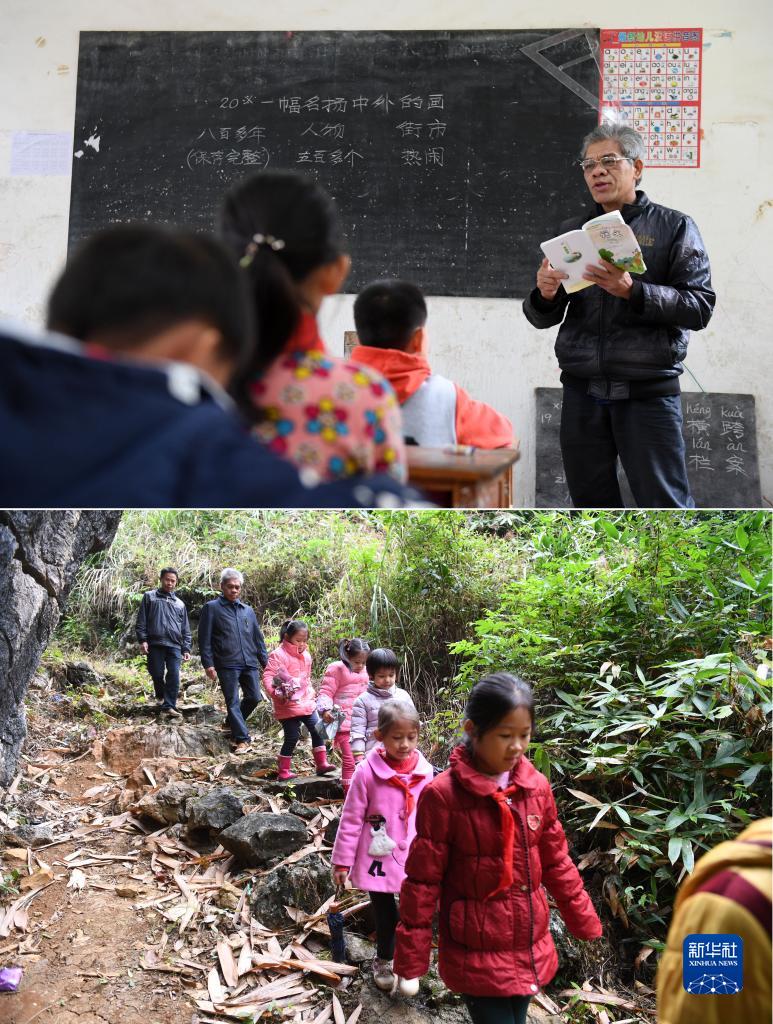 拼版照片:广西大新县宝圩乡那排教学点的覃诚老师给学生上课(上图),覃诚老师(左二)和同事覃永忠老师(左一)陪学生走山路回家(下图)(2017年11月24日摄)。时年54岁的覃诚在边境学校工作已经26年。因患上视网膜血管炎,左眼视力为0.3,右眼视力仅为0.01,但为了学生课程不落下,他坚持每天吃药带病上课。