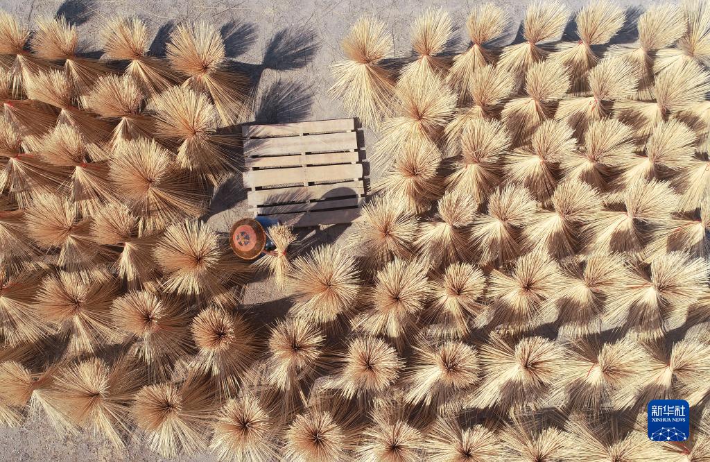 9月10日,在湖南省娄底市双峰县石牛乡一竹制品生产企业,工人在晾晒竹制半成品(无人机照片)。