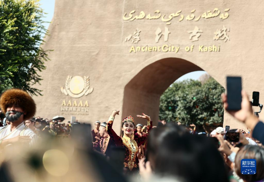 游客在新疆喀什古城景区东门观看开城仪式表演(9月7日摄)。