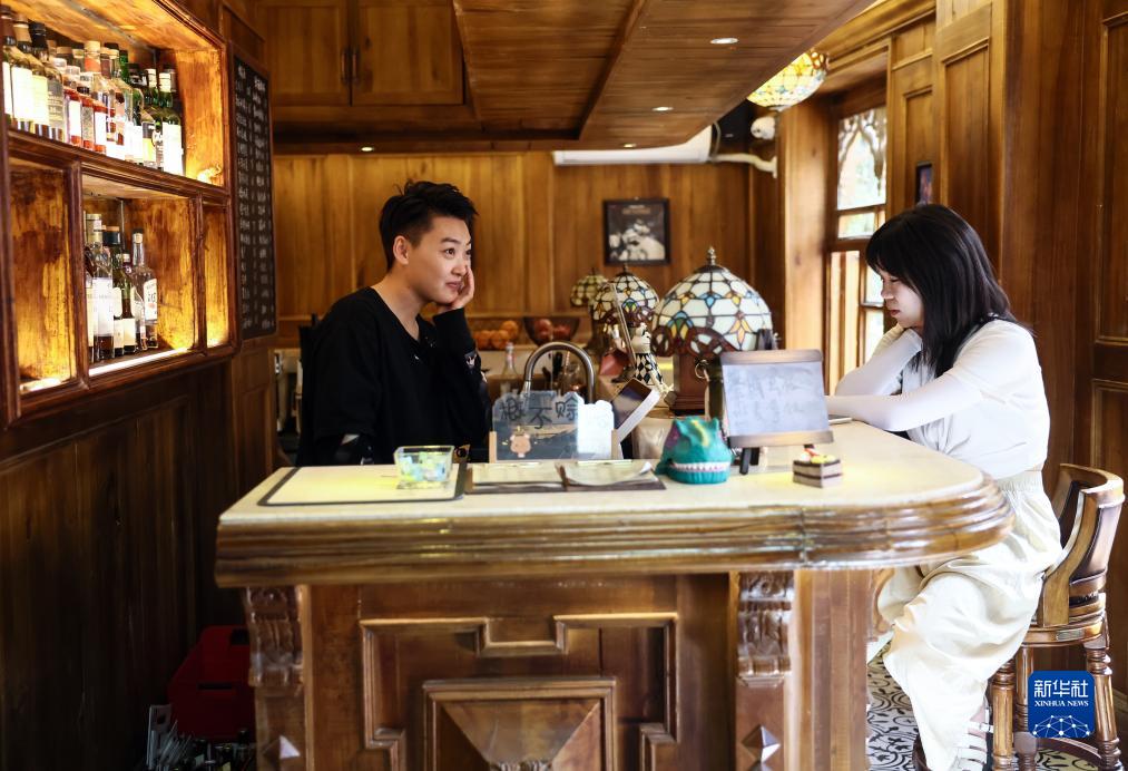 在新疆喀什古城景区图娜咖啡酒吧内,经营者(左)和顾客在聊天(9月7日摄)。