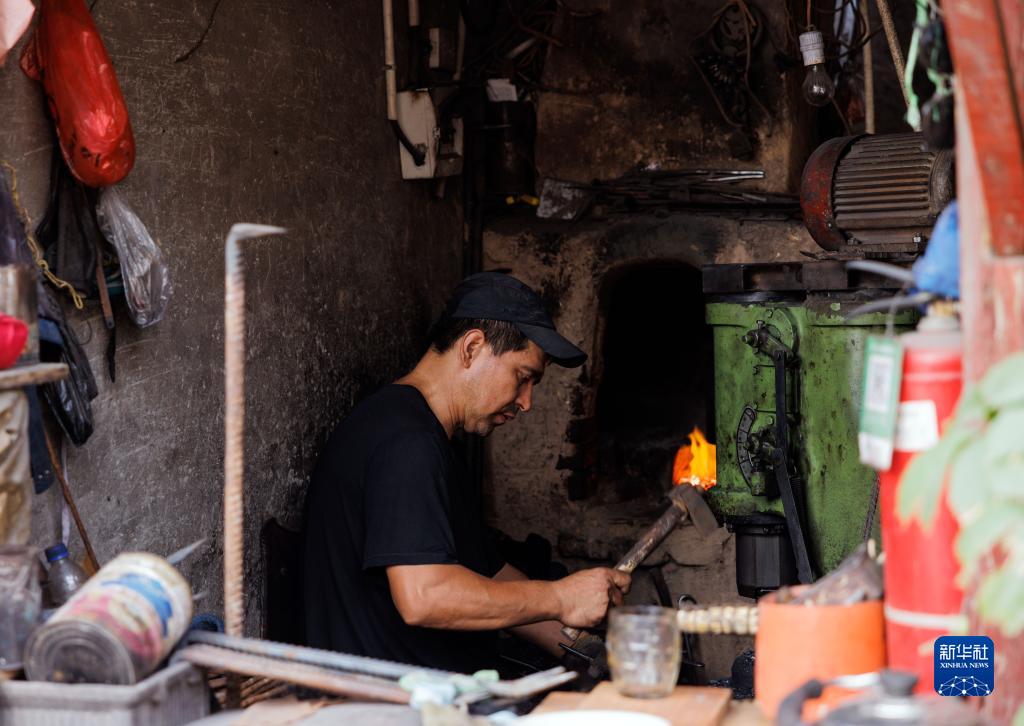 在新疆喀什古城景区内,手艺人在制作铁器(9月7日摄)。