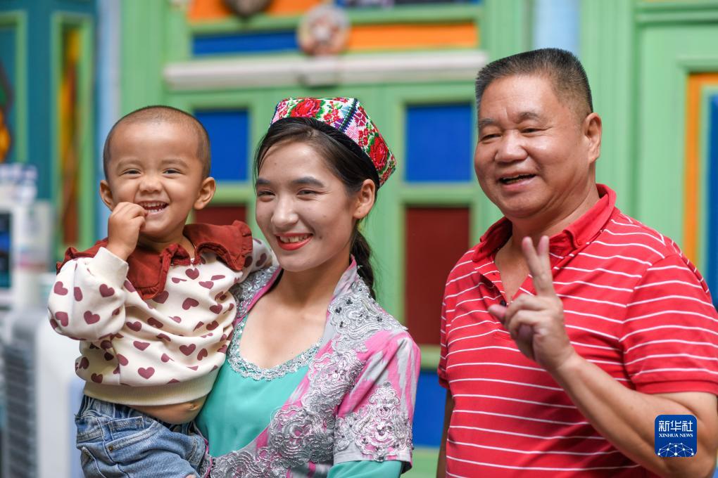 在新疆喀什古城景区“古丽的家”旅游家访点,游客在与演员合影留念(9月7日摄)。