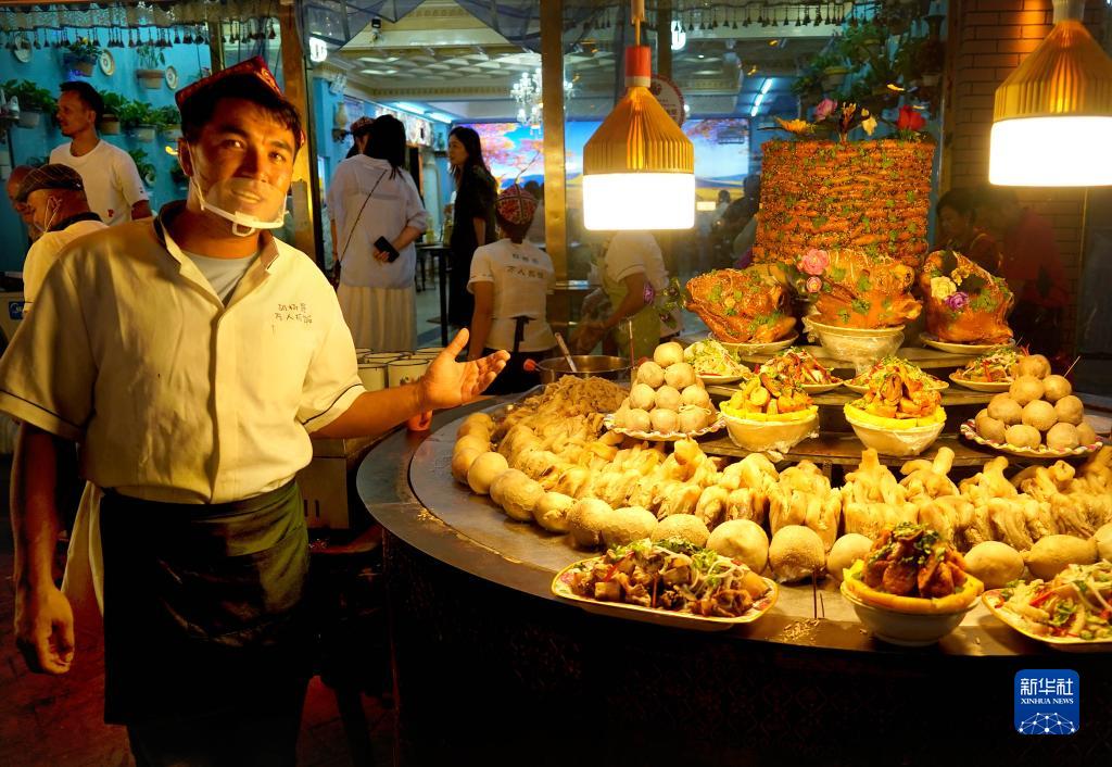 在新疆喀什古城景区内,工作人员在夜市上出售美食(9月4日摄)。