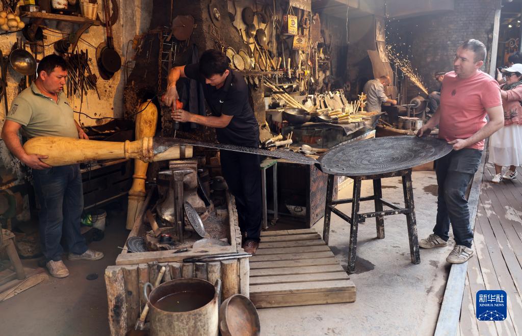 在新疆喀什古城景区铁业公社内,手艺人在制作铁器(9月6日摄)。
