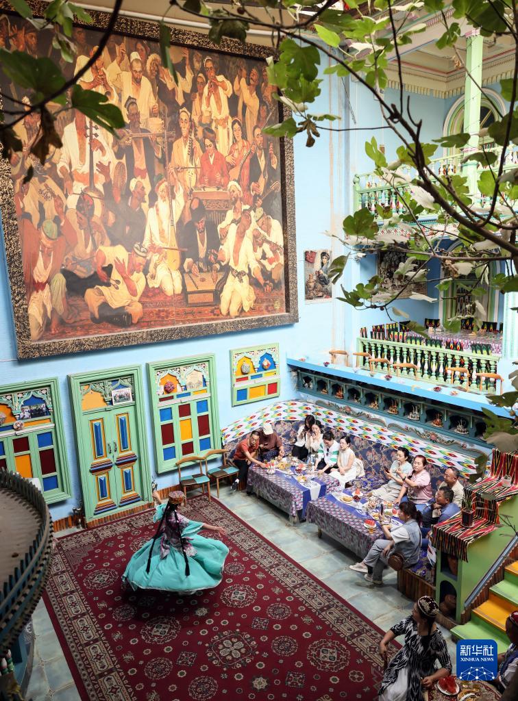 在新疆喀什古城景区“古丽的家”旅游家访点,演员在随音乐起舞(9月7日摄)。