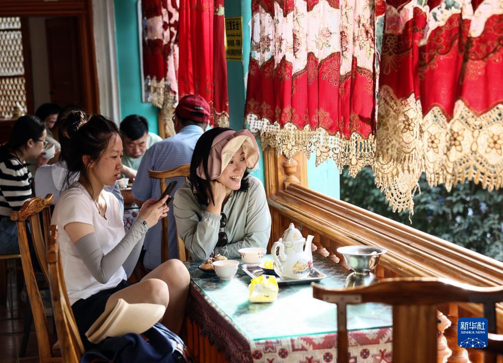 在新疆喀什古城景区百年老茶馆内,游客在品茶小憩(9月7日摄)。