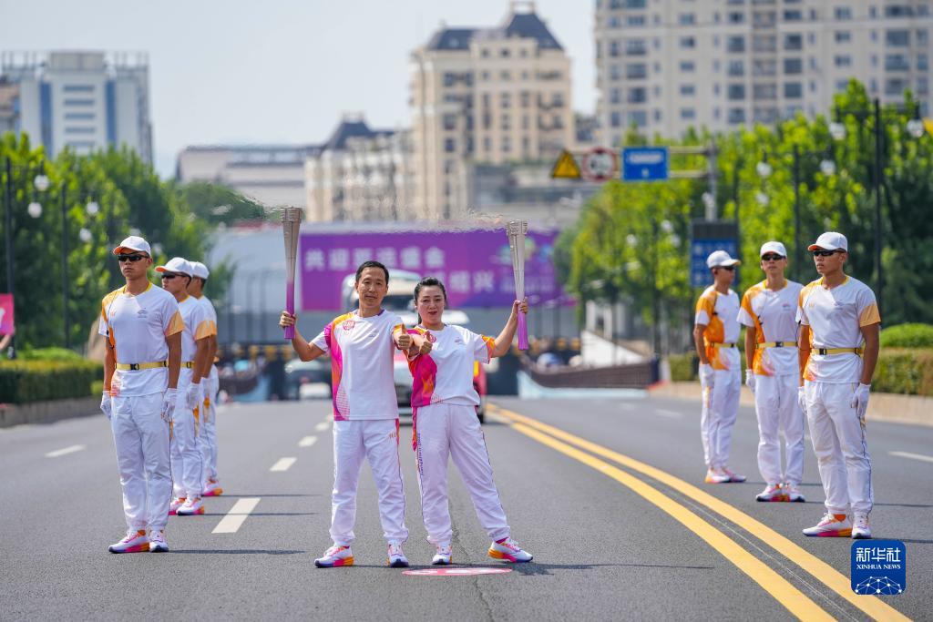 9月11日,火炬手单杰(左)和张迪在火炬传递中。
