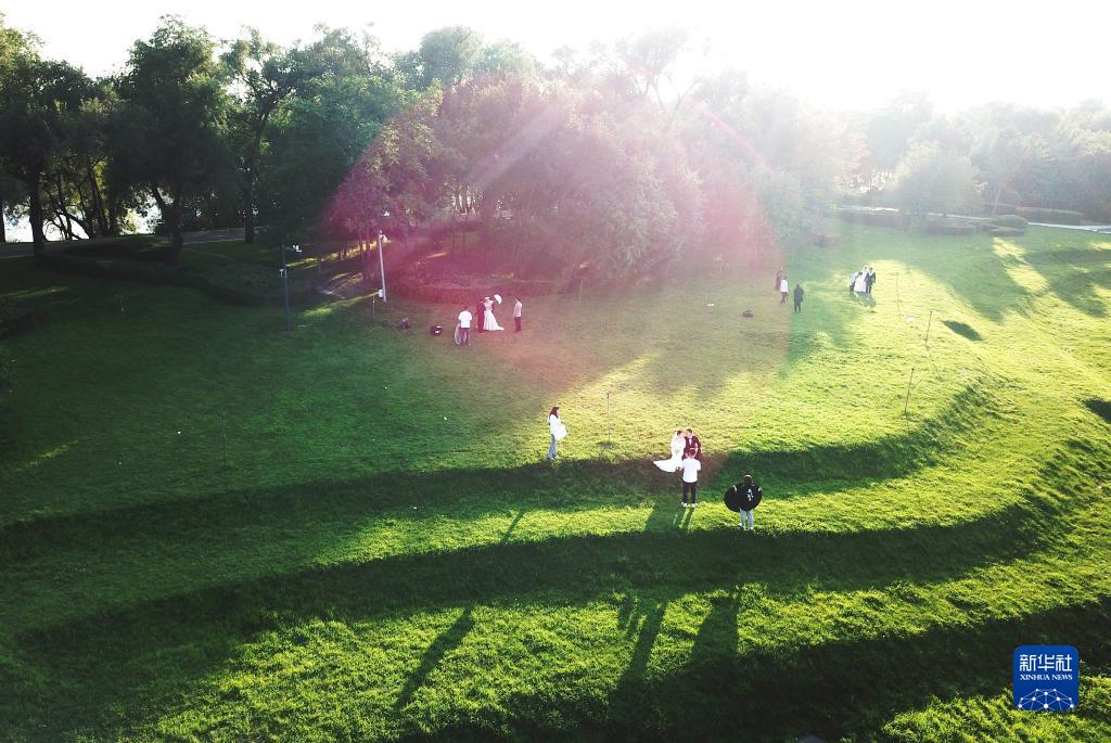 情侣在太阳岛景区拍摄婚纱照(7月31日摄,无人机照片)。