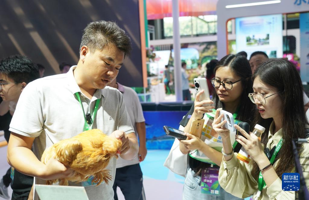 9月11日,在第三十届中国北京种业大会种业振兴成果展现场,工作人员(前左)向媒体记者介绍北京油鸡。