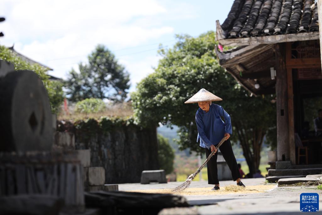 9月10日,湖南省怀化市通道侗族自治县坪坦村村民忙着晾晒稻谷。