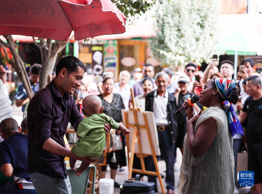 海迪雅(前右)在自家咖啡馆前唱歌,丈夫迪力夏提抱着孩子与她互动(9月7日摄)。