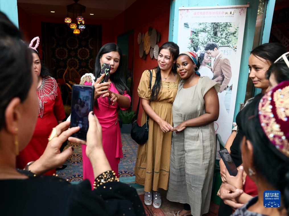 游客在咖啡馆前和海迪雅(中右)合影留念(9月7日摄)。