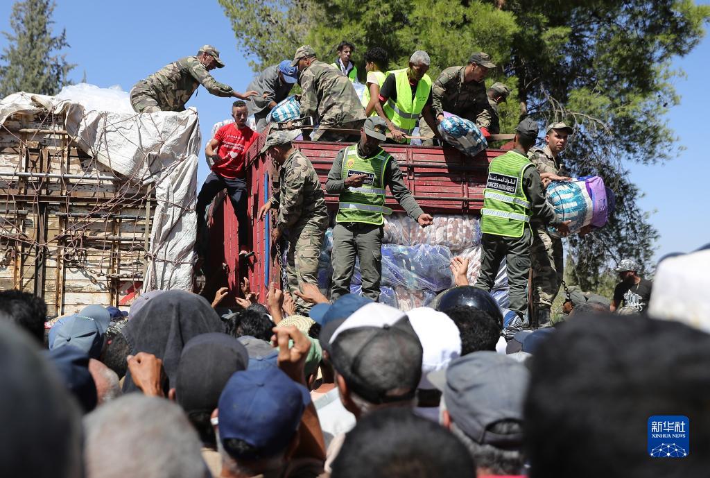 9月11日,救援人员在摩洛哥马拉喀什南部的艾米兹米兹村分发救灾物资。