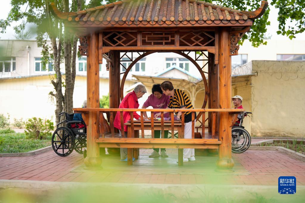 9月12日,老人们在河北省唐山市古冶区一家养老机构的院子里下棋。