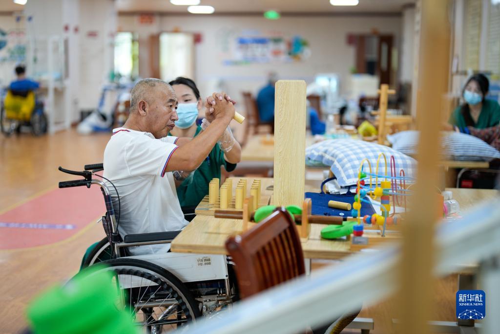 9月12日,河北省唐山市古冶区一家养老机构的工作人员指导老人进行手部康复训练。
