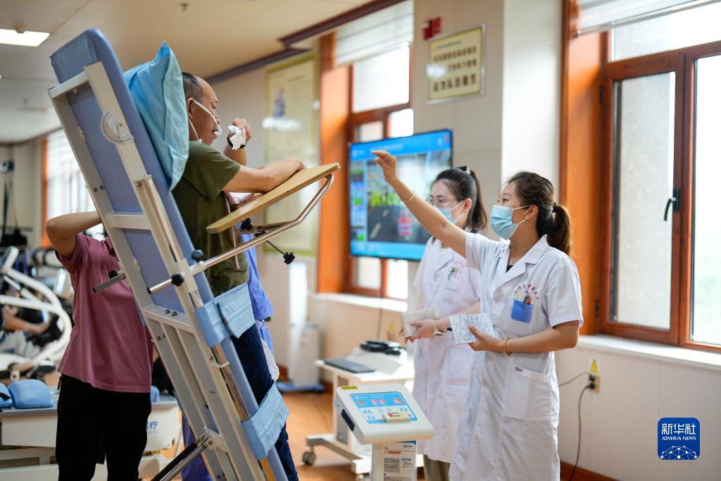 9月12日,河北省唐山市古冶区一家养老机构的工作人员指导老人进行康复训练。