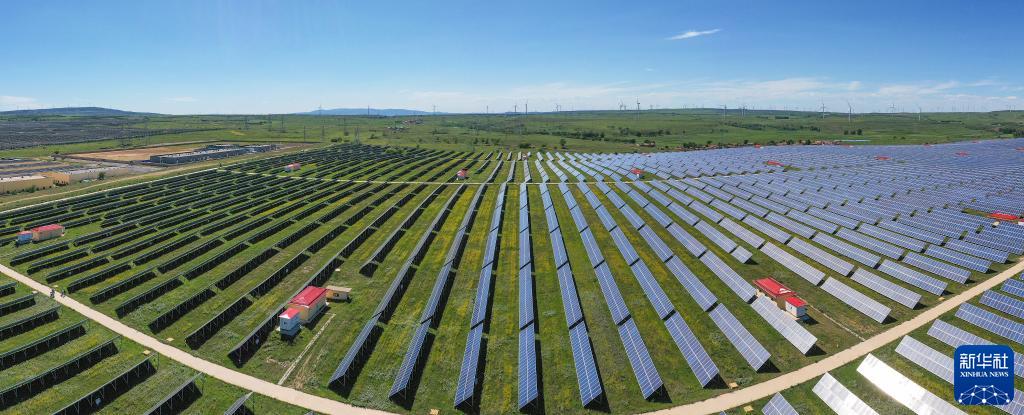 光伏板整齐排列在位于河北省张家口市的国家级可再生能源示范区内(2023年8月18日摄,无人机照片)。
