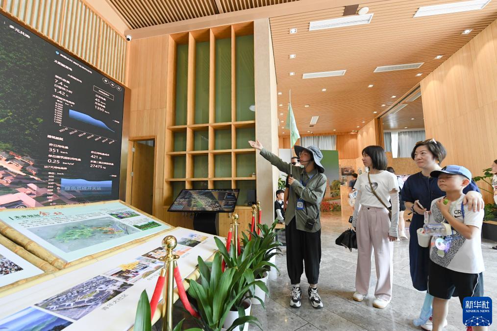 游客在浙江省湖州市安吉县余村未来乡村展馆了解当地绿色用能情况(2023年8月11日摄)。 2023年8月初,浙江省湖州市安吉县余村成功进行了首次“绿电绿证”交易,购买来自宁夏、黑龙江、安徽等地的光伏和风力电621.2万千瓦时,购买“绿证”2878张,相当于减排二氧化碳2869吨,实现了全域“绿电”供应,标志着余村向建设“零碳乡村”迈出重要一步。