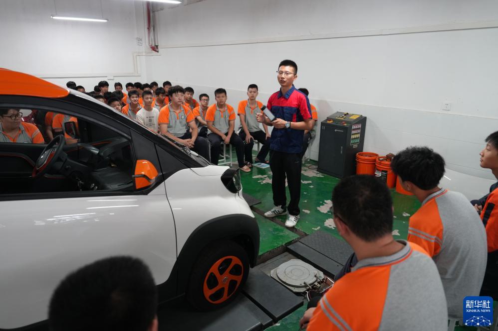 9月12日,在重庆市北碚区职业教育中心新能源汽修实训室,教师在给学生讲解新能源汽车维修知识。