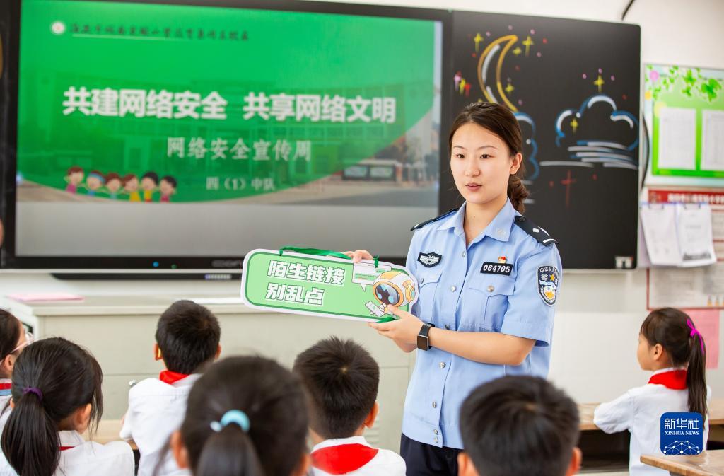 9月11日,在江苏省海安经济开发区实验小学,海安市公安局城东派出所民警在给小学生普及网络安全知识。