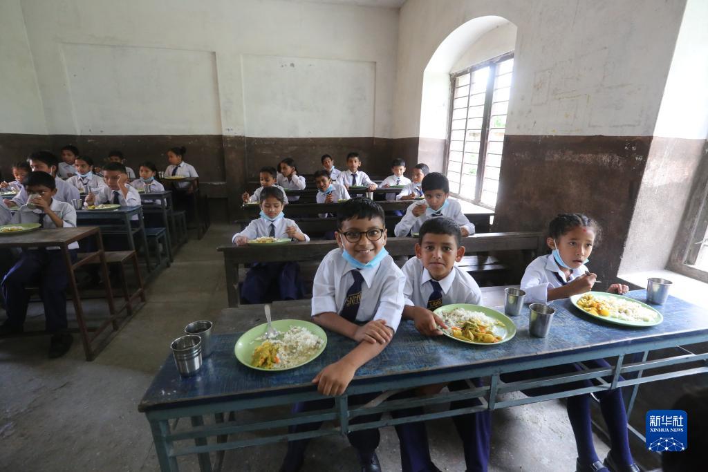 这是2022年7月11日,在尼泊尔加德满都,学生在微笑儿童项目启动仪式后就餐。由“全球发展和南南合作基金”支持的微笑儿童项目启动仪式7月11日在尼泊尔首都加德满都一所中学举行,项目惠及3600名尼泊尔学生。