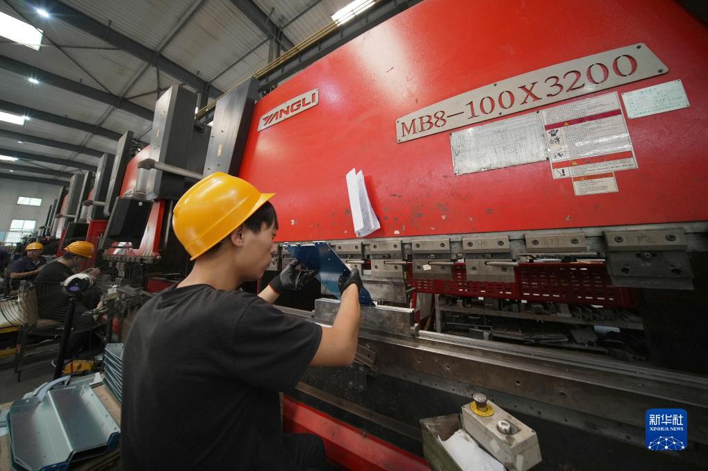 9月12日,工作人员在沧州惠邦机电产品制造有限公司生产车间加工机箱部件。