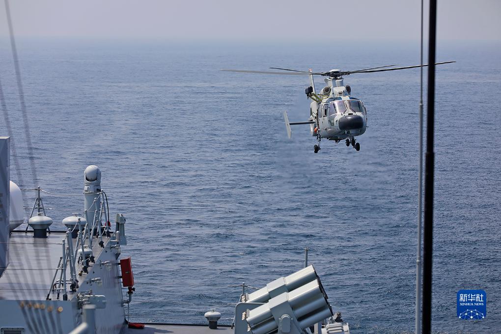 中国海军第45批护航编队在任务准备期间组织舰载直升机起降训练(8月25日摄)。