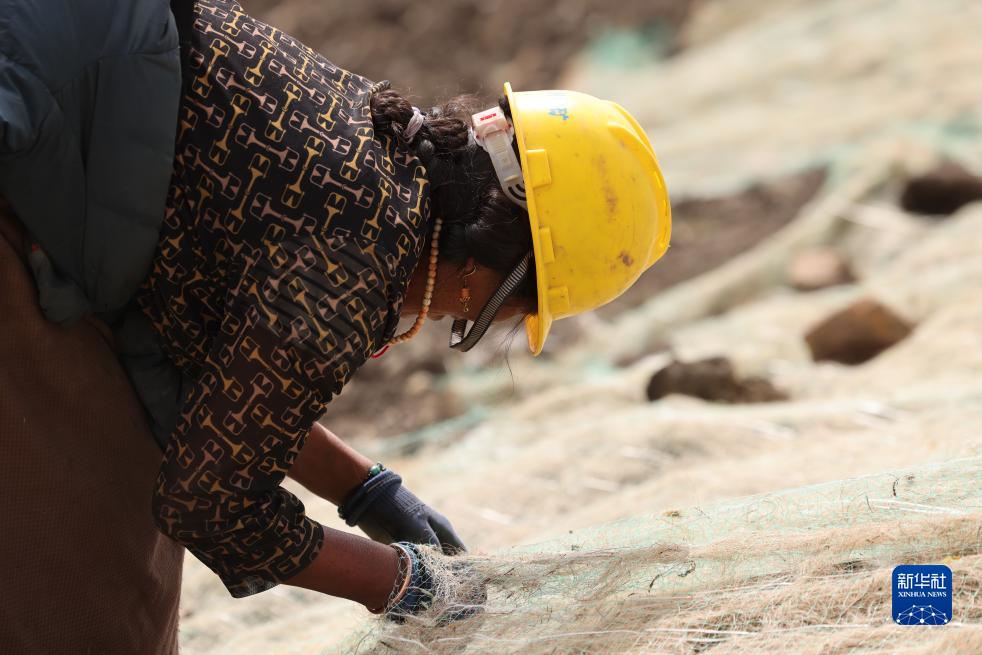 在若尔盖县达扎寺镇多玛村废弃矿山治理点,工人在边坡上铺椰丝毯(8月23日摄)。