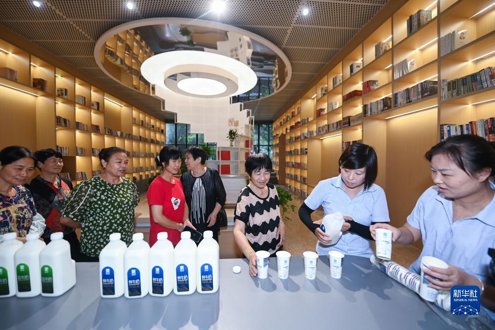 9月12日,建德市更楼街道更化社区的居民在鲜奶共富工坊的书吧内品尝刚生产出来的鲜奶。