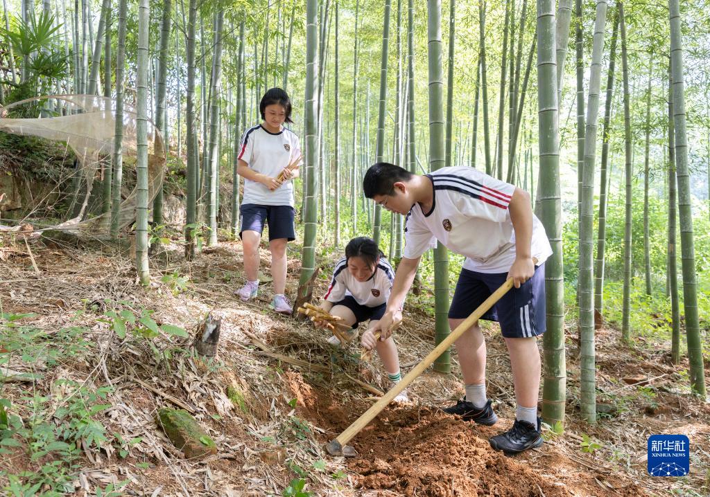 9月12日,浙江省诸暨市学勉中学的学生在竹园挖笋。