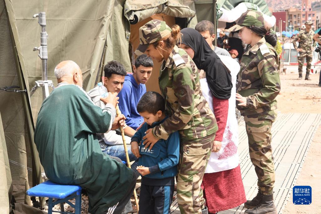 9月12日,救援人员在位于摩洛哥豪兹省艾斯尼村的临时军事医院引导灾民。