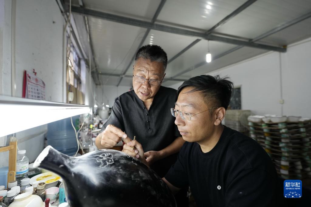 9月12日,戴佩维(左)在指导儿子戴博霖陶瓷雕金技巧。