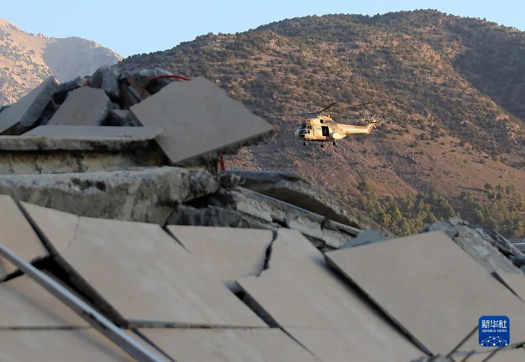 9月12日,救援直升机在震中区域的摩洛哥豪兹省塔拉特恩雅库布村附近飞行。