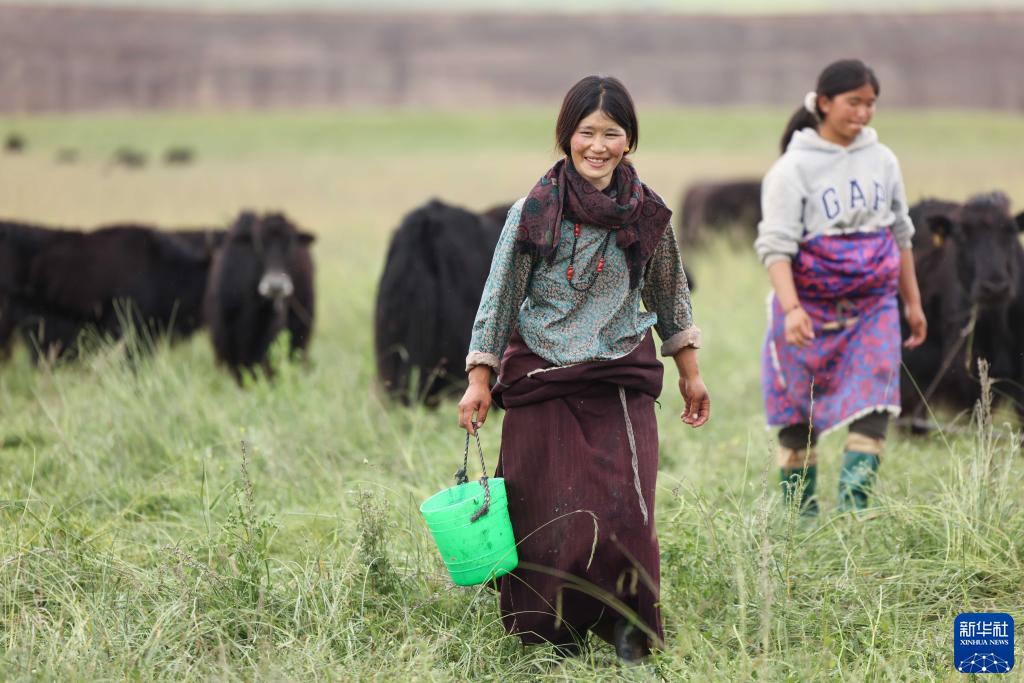 8月17日,在青海省黄南藏族自治州河南蒙古族自治县多松乡多松村,扎西曲培的妻子斗格吉(左)准备去挤牛奶。新华社记者 邢广利 摄