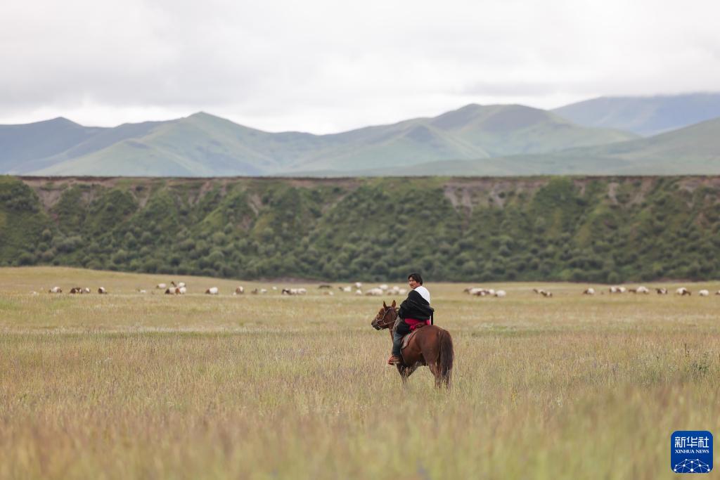 8月17日,在青海省黄南藏族自治州河南蒙古族自治县多松乡多松村,扎西曲培在放牧。新华社记者 邢广利 摄