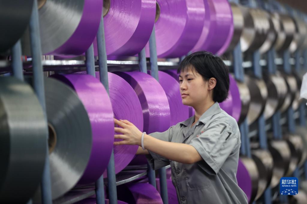 9月13日,德清县禹越镇一家新材料生产企业的工人在车间检测纺织产品。