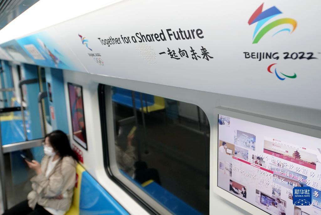 这是9月13日拍摄的北京地铁11号线(冬奥支线)列车车厢内部的冬奥元素装饰。
