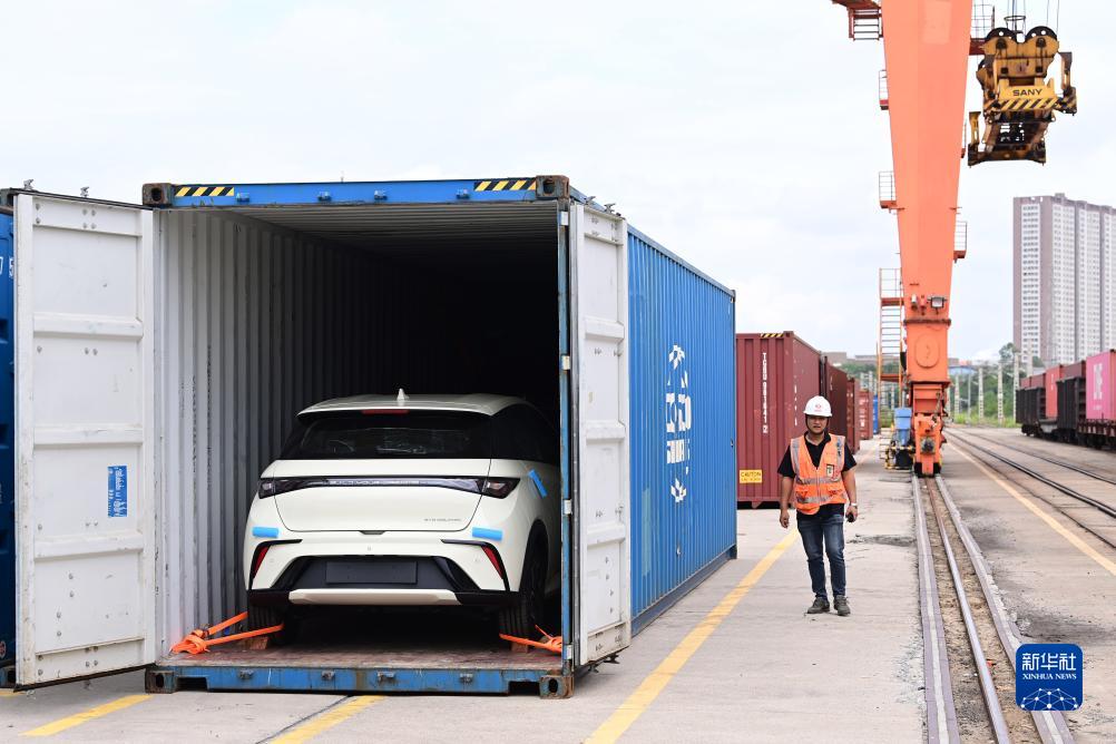 9月13日,在江西赣州国际陆港,新能源汽车已装运至集装箱内。