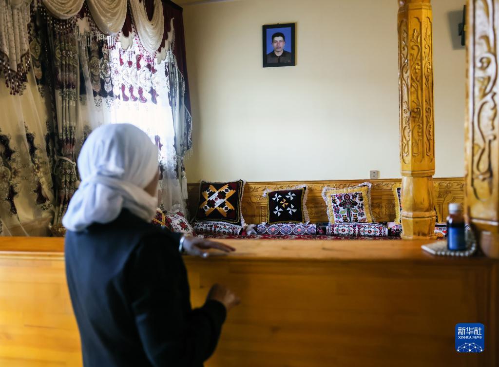 9月5日,拉齐尼的妻子阿米娜·阿力甫夏在自己家中的客厅里注视丈夫的照片。新华社记者 兰红光 摄