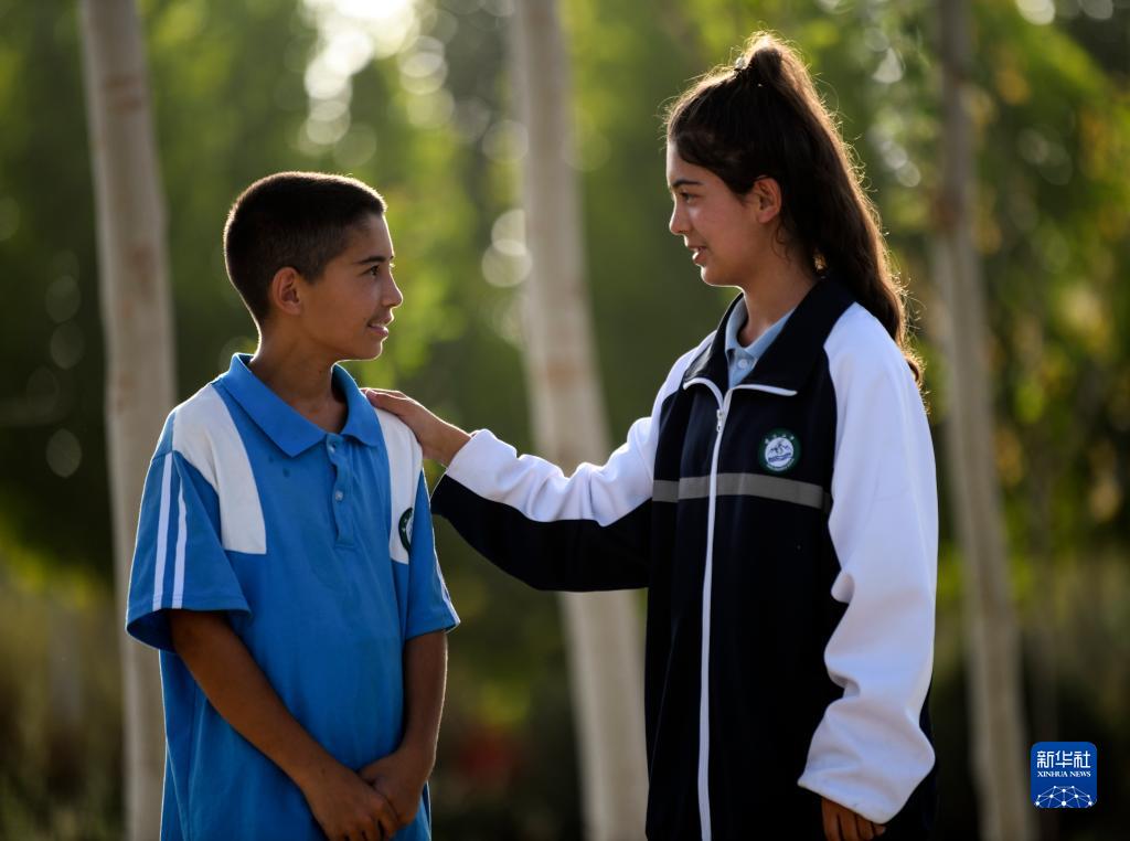 9月7日,在新疆喀什第二中学院内,拉齐尼的女儿都尔汗·拉齐尼和她的弟弟拉迪尔·拉齐尼聊天,姐姐鼓励弟弟要好好学习。新华社记者 王菲 摄