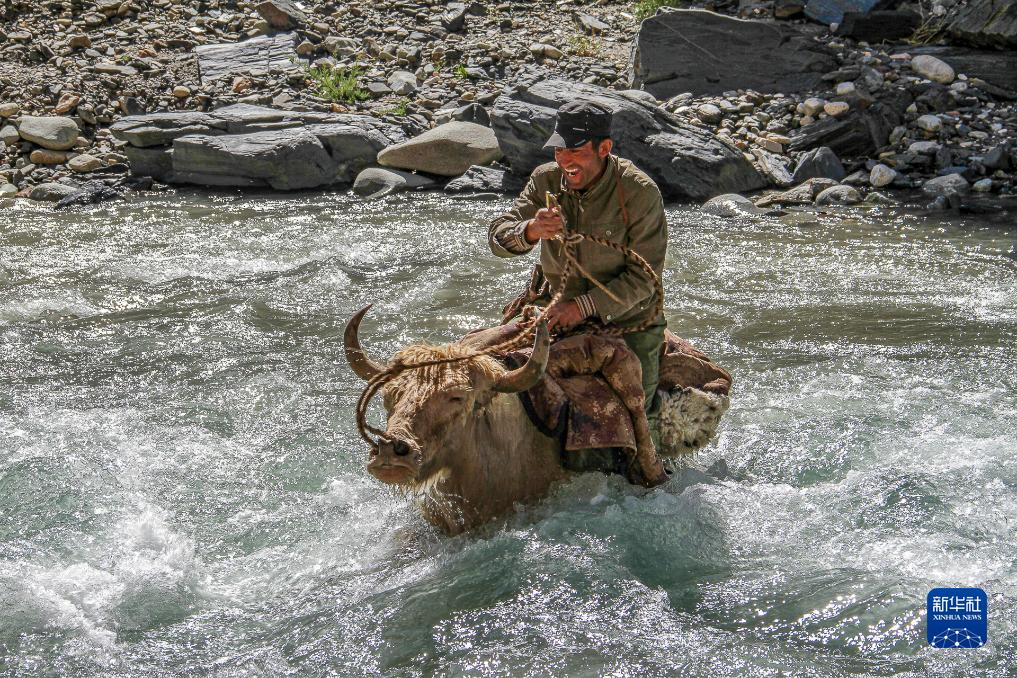 2012年9月21日,拉齐尼骑着牦牛在巡逻路上淌过湍急的河流。新华社发(王烈 摄)