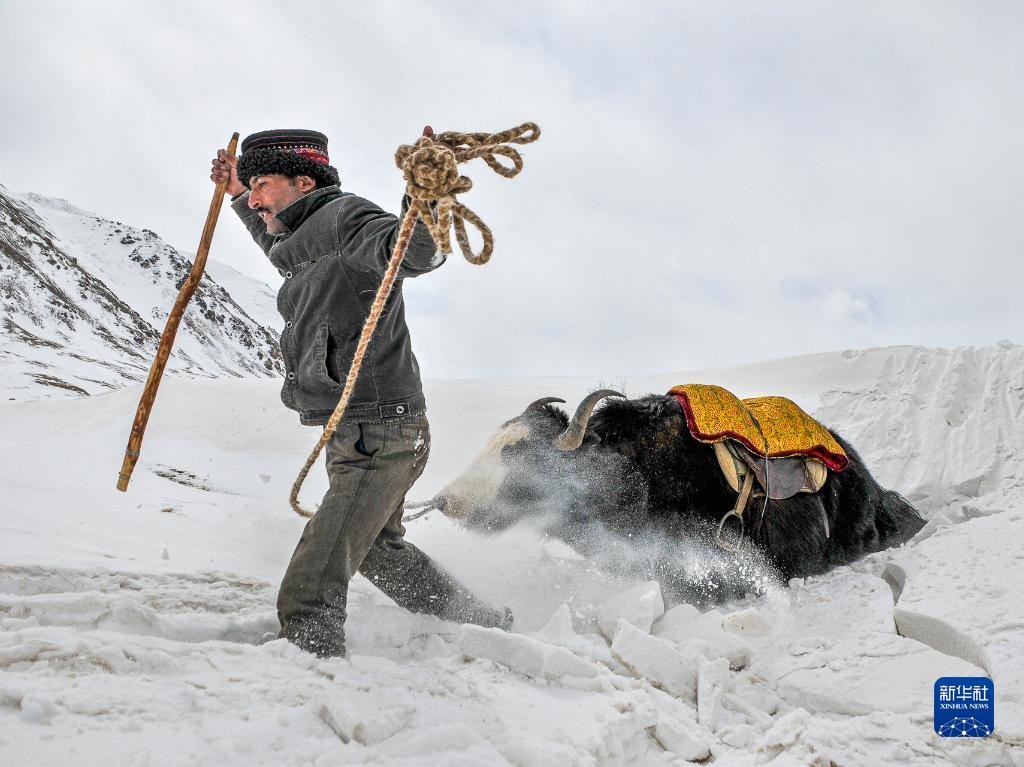 2009年3月6日,拉齐尼牵着牦牛踏着厚厚的积雪在边境线上巡逻。新华社发(王烈 摄)