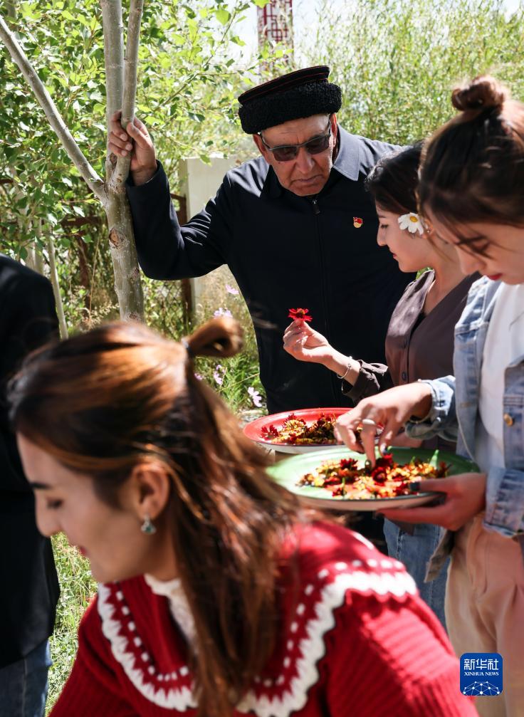 9月4日,村里的年轻人前来巴依卡老人家中,帮助他采摘家里种植的雪菊。新华社记者 兰红光 摄