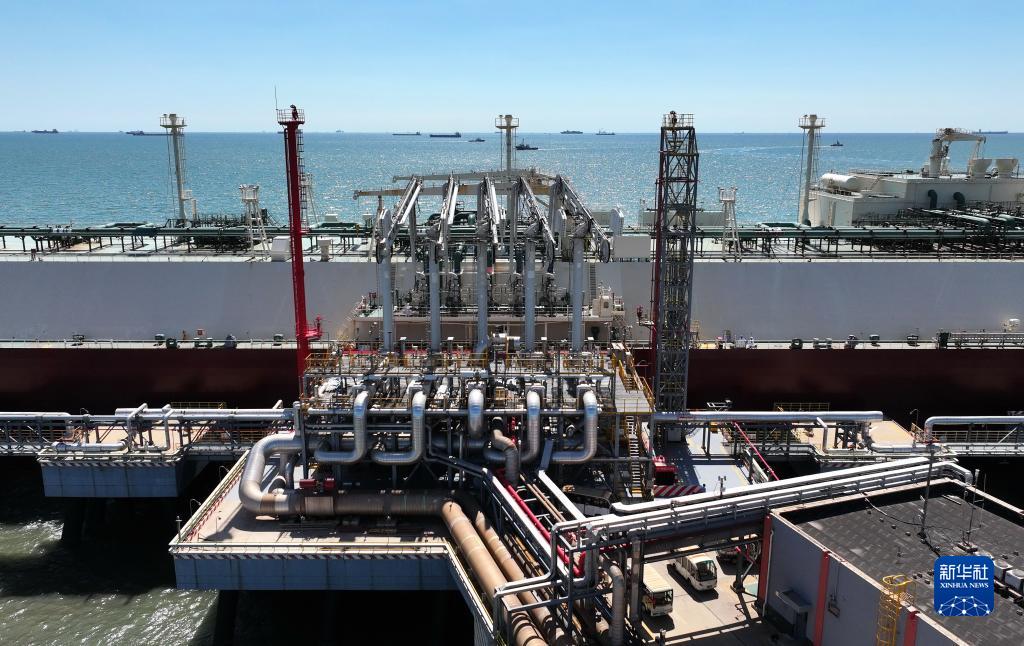 9月13日,来自卡塔尔的“米萨梅尔”号LNG轮靠泊在唐山港曹妃甸港区中国石油唐山LNG接收站码头卸载(无人机照片)。